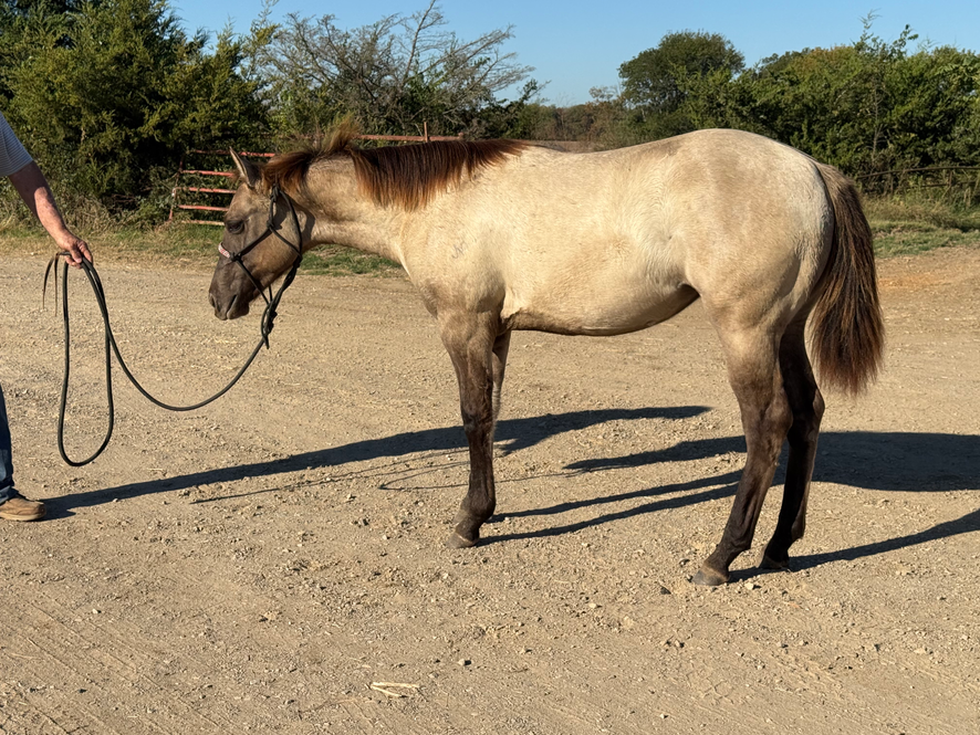 Double homozygous black and dun and panel negative across the board. A super performance prospect and later on a tremendous broodmare that will always produce a black bases dun factor baby no matter what she’s bred to. High foundation too